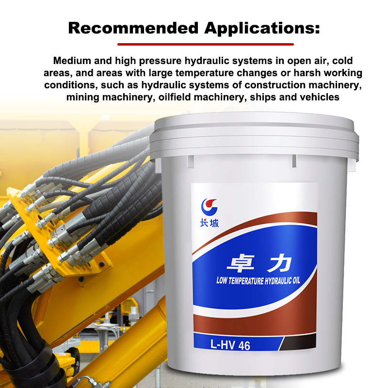 Great Wall Zhuoli L-HV 46 low-temperature hydraulic oil is formulated using a highly refined, high-viscosity index base oil and a selection of excellent functional additives, blended using internationally advanced production processes. This product is particularly suitable for medium- and high-pressure hydraulic systems operating outdoors, in cold regions, and in environments subject to severe temperature fluctuations or harsh operating conditions. This product is available in grades 32, 46, and 68 based on its kinematic viscosity at 40°C.