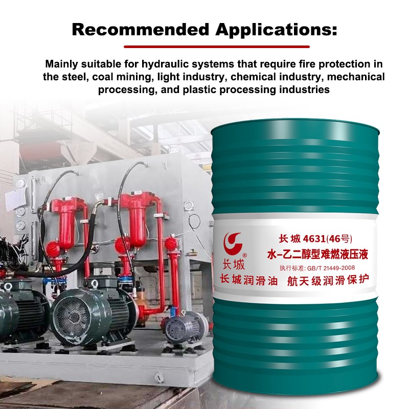 Widely used in hydraulic systems operating in environments exposed to open flames and high temperatures, it serves as an important flame-resistant hydraulic fluid. Primarily suitable for hydraulic systems requiring fire protection in the steel, coal mining, light industry, chemical industry, mechanical processing, and plastics processing industries.