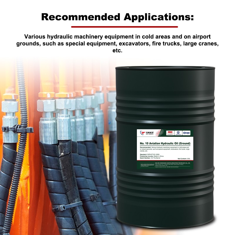 AVIC Hangte No. 10 Aviation Hydraulic Fluid (Ground Use) is formulated from deeply refined, deeply dewaxed, low-pour point base oils and synthetic additives. It is suitable for use as a working fluid in high-performance hydraulic systems. Its extremely low pour point allows it to be used in various hydraulic equipment in extremely cold regions. Its operating temperature is limited to -50°C and above.