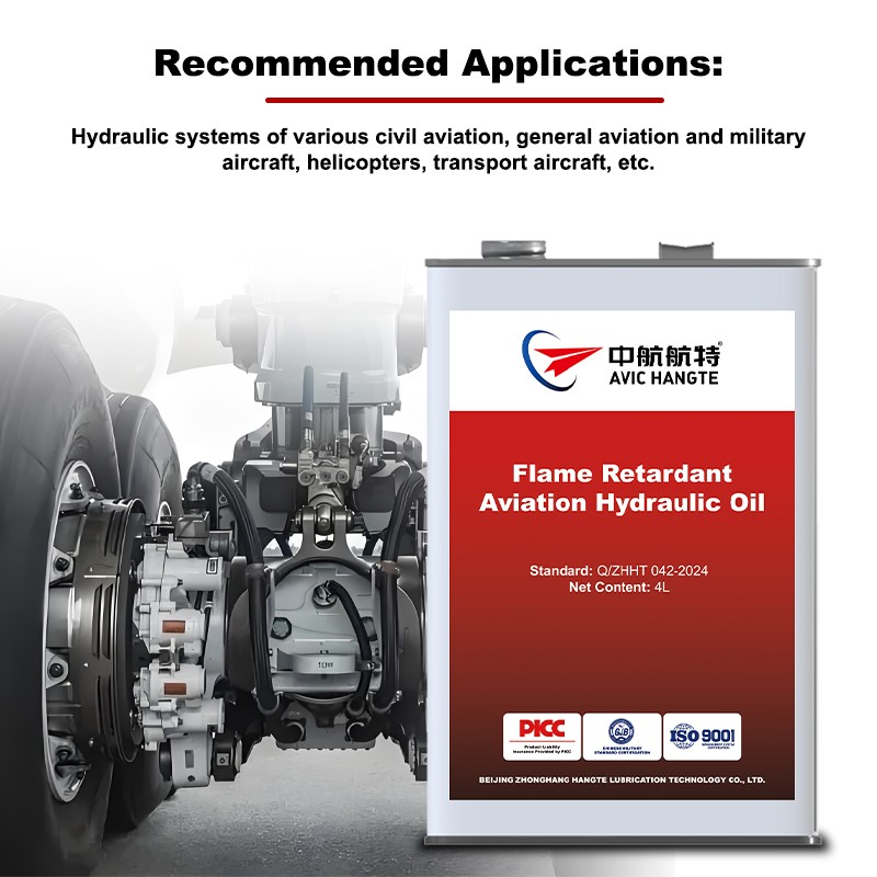 AVIC Hangte Flame-Retardant Aviation Hydraulic Fluid is a phosphate-based, flame-retardant hydraulic fluid with a flash point as high as 160°C and a fire point above 177°C. It offers excellent flame resistance, low-temperature performance, and corrosion resistance.
