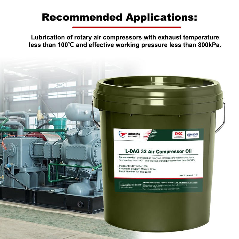 AVIC HANGTE L-DAG Air compressor oil is composed of deeply refined mineral base oil and selected anti-oxidation, anti rust and anti-corrosion additives, suitable for various light load oil injection rotary air compressors. This product is classified into grades 15, 22, 32, 46, 68, 100, etc. according to its 40 ℃ kinematic viscosity.