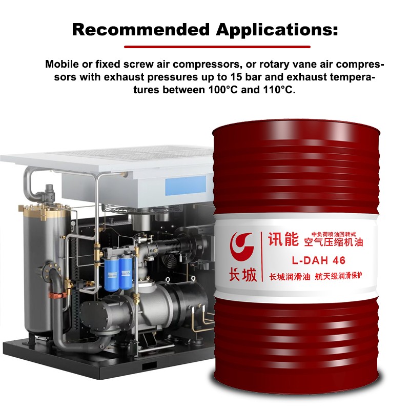 Sinopec L-DAH Screw Air Compressor Oil 46# (Oil-Injected Rotary Air Compressor Oil) is made from hydrogenated base oil and blended with a variety of ashless additives. It is suitable for lubricating various medium-load oil-injected rotary (screw and vane) air compressors. This product is available in grades 22, 32, 37, and 46 based on kinematic viscosity at 40°C.