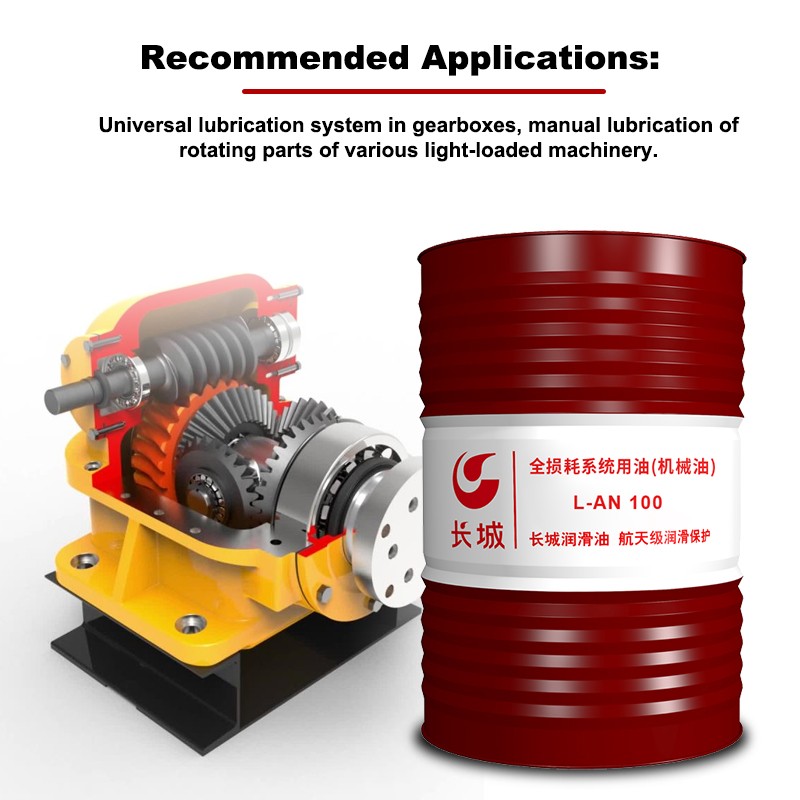 Sinopec L-AN Total Loss System Oil 100# is blended using highly refined, high-quality base oils and additives, using internationally advanced production processes. This series of lubricants is designed to meet the lubrication requirements of light-load equipment and is available in five grades with kinematic viscosities of 32, 46, 68, 100, and 150 at 40°C.