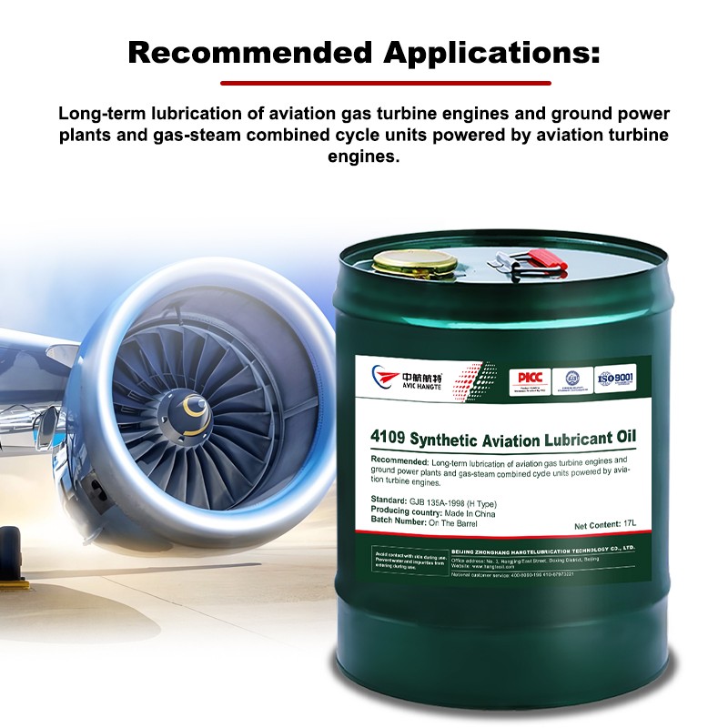 AVIC Hangte 4109 Aviation Lubricant is composed primarily of synthetic base oils and antioxidants, corrosion inhibitors, and anti-wear agents. It is a low-viscosity engine lubricant that complies with the US Military Standard MIL-L-7808H and has an operating temperature range of -50°C to 175°C, with a short-term operating temperature range of up to 200°C.