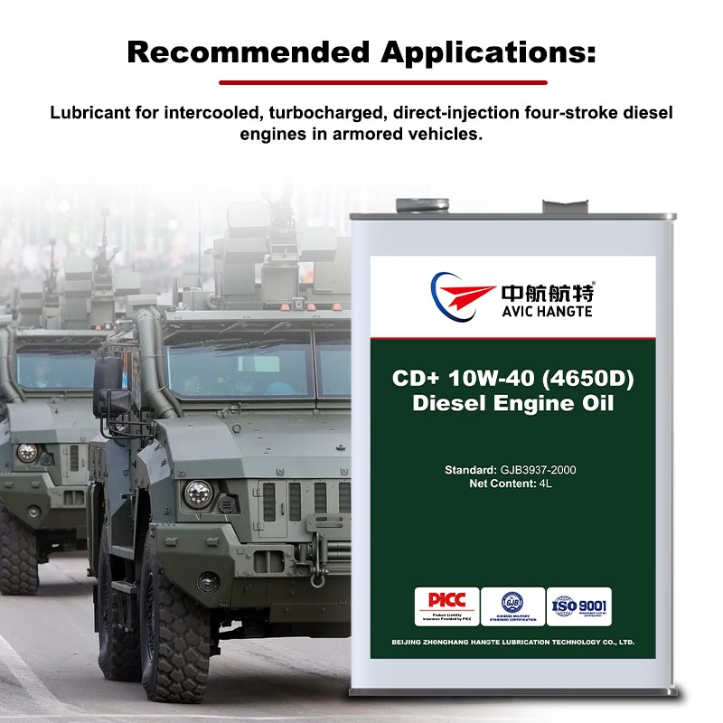 AVIC Hangte CD+ 10W-40 Diesel Engine Oil, also known as 4650D, is primarily designed for military heavy-duty diesel engines. It is suitable for use in combat vehicle engines and transmissions subjected to high loads and severe loads, as well as in complex environments such as extreme cold, extreme heat, drought, and humidity. Operating temperatures range from -25°C and above.
