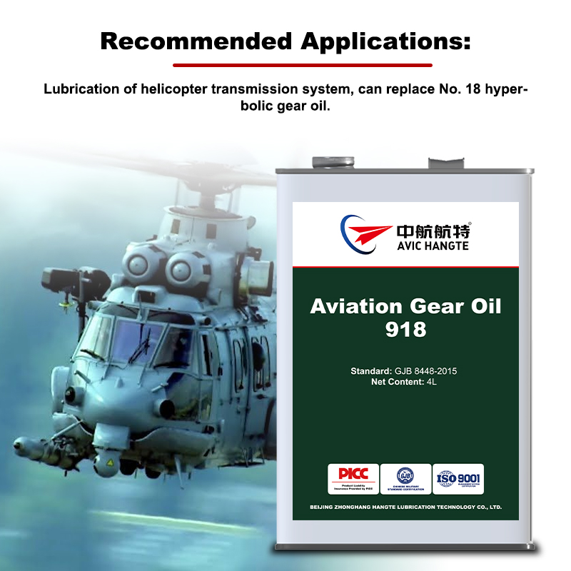 AVIC Hangte 918 Aviation Gear Oil is primarily used for lubricating helicopter intermediate reducers, tail reducers, tail drive shafts, fan drive shafts, vertical and horizontal joints, and other components. It offers excellent viscosity-temperature performance, low-temperature fluidity, rust resistance, anti-foaming properties, and extreme pressure resistance.