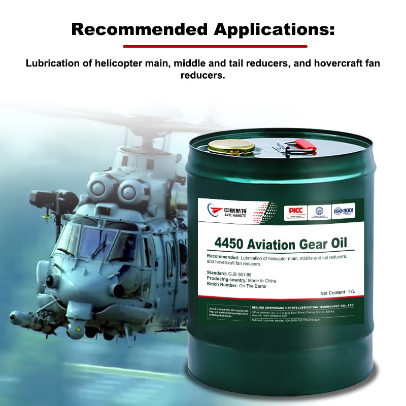 AVIC Hangte 4450 Aviation Gear Oil is formulated using a synthetic hydrocarbon base oil and refined with sulfur-phosphorus extreme pressure agents, antioxidants, and other additives. It is a high-extreme-pressure aviation gear oil specifically developed for aviation gear sets, reducers, and transmission systems.