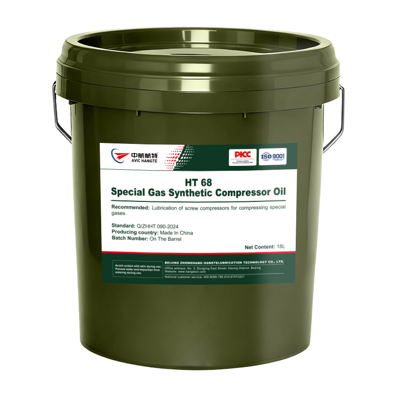 AVIC Hangte HT special gas synthetic compressor oil is a synthetic compressor oil made by adding antioxidant and other additives to synthetic oil. According to international classification standards, it belongs to the ISO L-DAC series and is suitable for gas compressors used in refineries, oil and gas fields, coking plants, mines, compressed natural gas, gas, liquefied propane, chlorine fluorine derivatives, ethylene, butadiene, vinyl chloride and other hydrocarbon gases for pressurized transportation, bottling, separation and recovery This product is divided into four grades based on its 40 ℃ kinematic viscosity: 68, 100, 150, 220, etc.